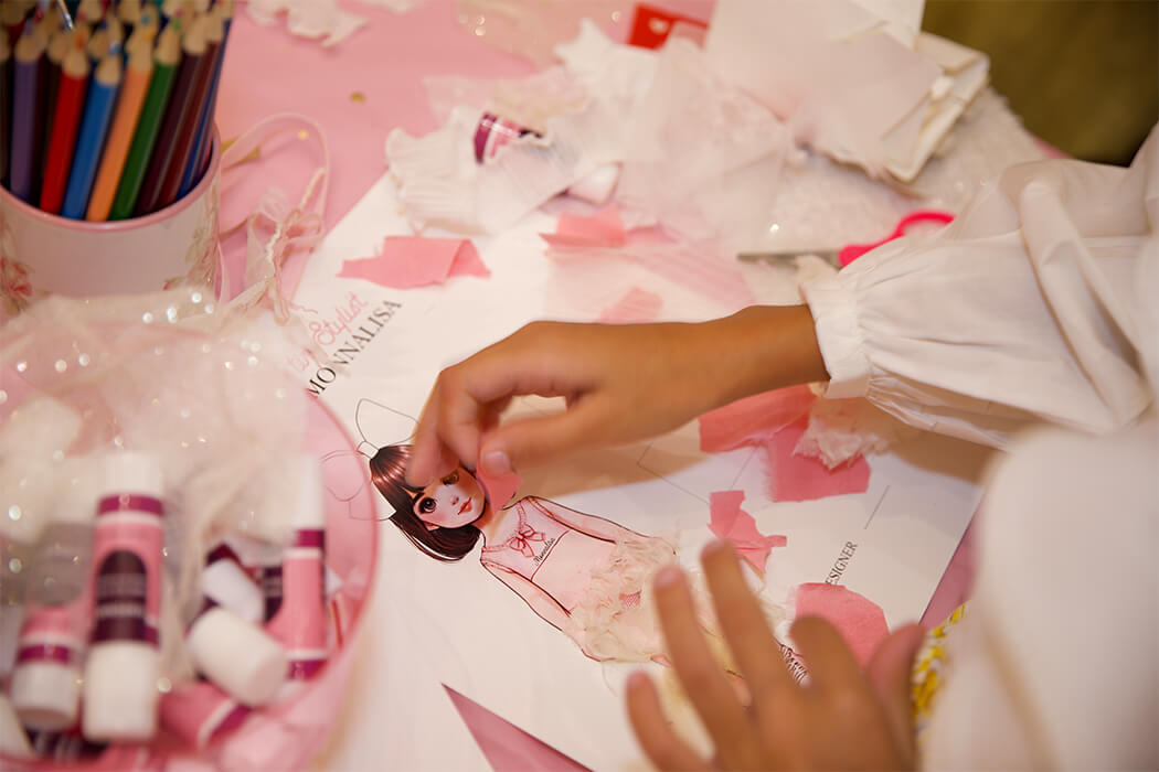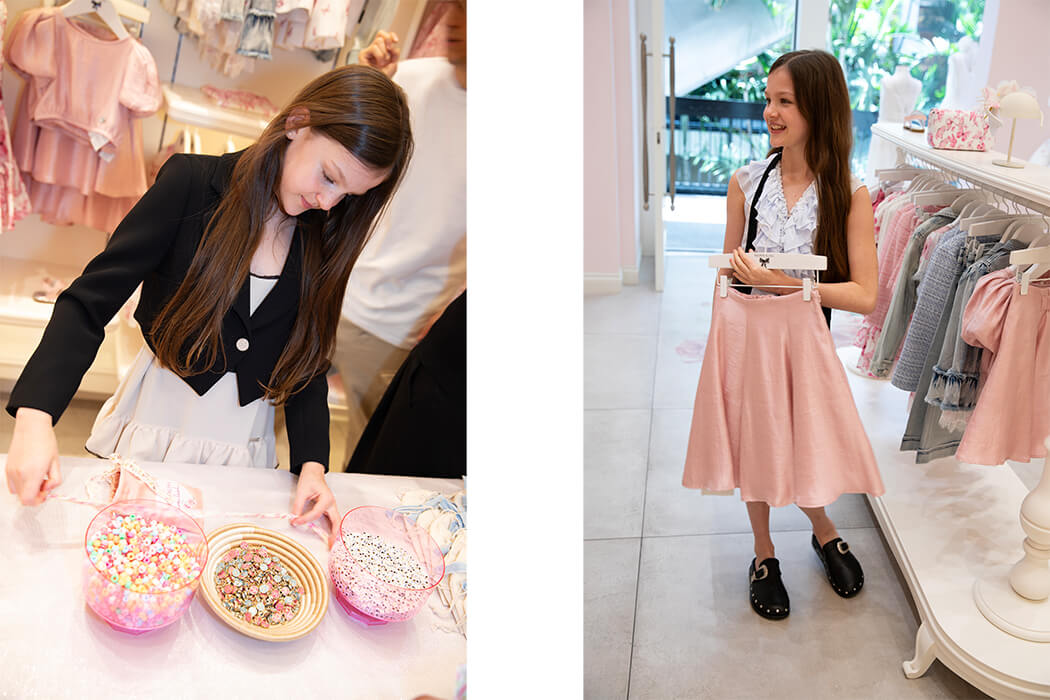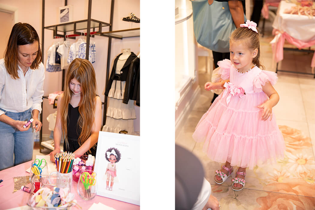 Monnalisa knows that fashion is more than just wearing something beautiful—it’s about creating beauty. At a special design station, mini guests got to dream big, using real Monnalisa fabrics flown in directly from the brand’s headquarters in Italy to design their own couture creations. Just steps away, another creative corner invited kids to make their own charm bracelets, adding a sparkle of personality with colorful beads and letter charms.