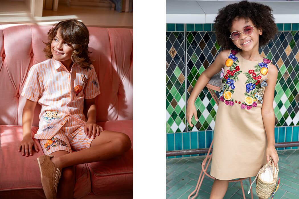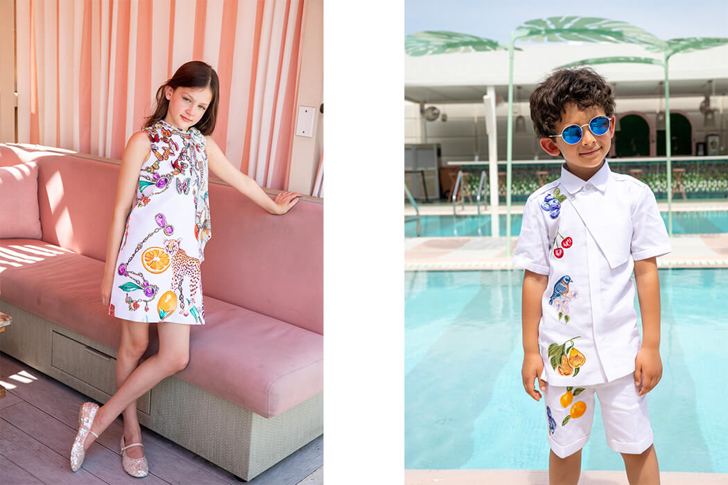 The capsule offers coordinated sibling looks that don’t match exactly but beautifully complement one another—an elevated take on the modern family look. The color palette is rich yet soft, and the prints are enchanting, evoking a dreamy, tropical escape.
